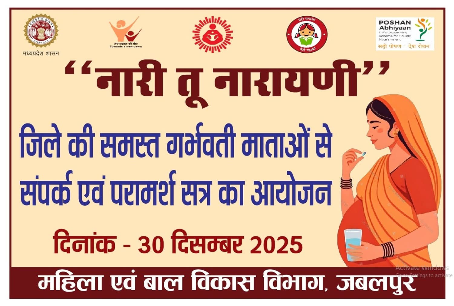 यह अभियान जिले के समस्त आंगनवाड़ी केन्द्रों में 30 दिसम्बर को सुबह 10 बजे से दोपहर 2 बजे तक चलाया जायेगा। इस अभियान के तहत जिले की समस्त गर्भवती माताओं के स्वास्थ्य और पोषण स्थिति के आकलन के लिए संपर्क एवं परामर्श सत्र का आयोजन किया जायेगा।
