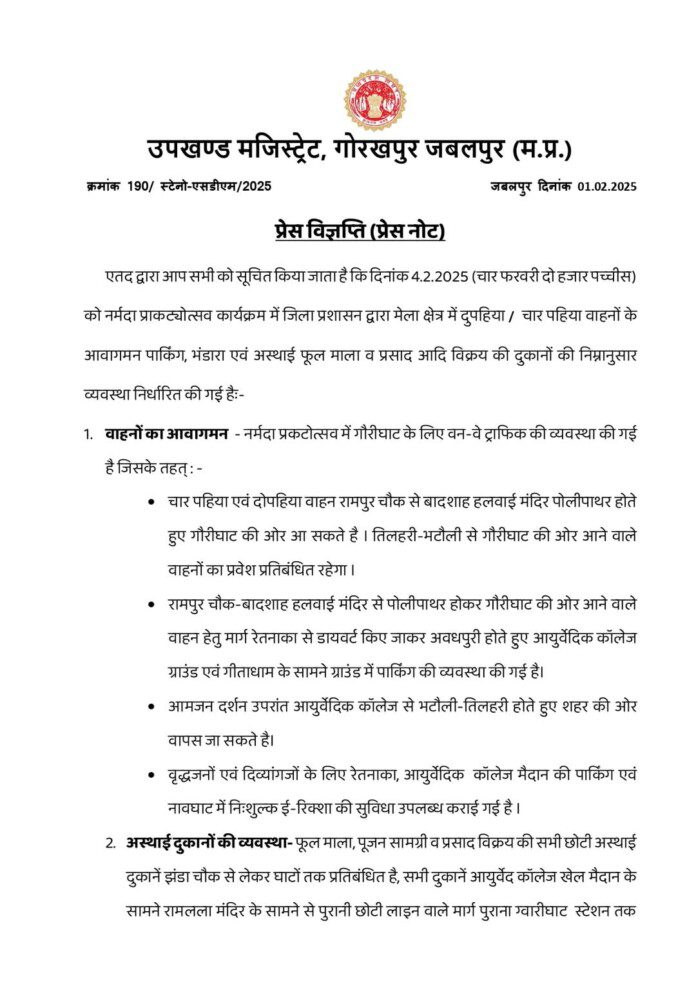 नर्मदा प्राकट्योत्सव पर 4 फरवरी को गौरीघाट में बड़ी संख्या में मां नर्मदा के दर्शन करने आने वाले श्रद्धालुओं की सुविधा को देखते हुए जिला प्रशासन द्वारा मेला क्षेत्र में दुपहिया, चार पहिया वाहनों के आवागमन, पार्किंग, भंडारा एवं अस्थाई फूल माला और प्रसाद विक्रय की दुकानों के लिए स्थान चिन्हित किये गये हैं। जिला प्रशासन द्वारा इस दिन सुगम यातायात के मद्देनजर वन-वे ट्रैफिक की व्यवस्था भी लागू की गई है।