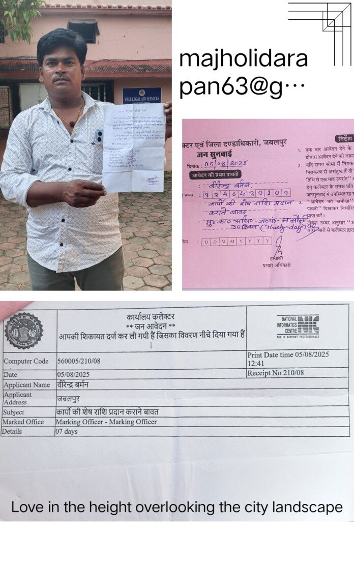 05 अगस्त 2025 को वीरेंद्र ने जबलपुर कलेक्टर कार्यालय में जनसुनवाई में आवेदन प्रस्तुत किया जिसे विधिवत रूप से स्वीकार कर प्रथम पावती दी गई है। पावती में यह उल्लेख है कि यदि 30 दिनों के भीतर निराकरण नहीं होता, तो वे अगली जनसुनवाई में “आवेदन की समीक्षा” हेतु उपस्थित हो सकते हैं।