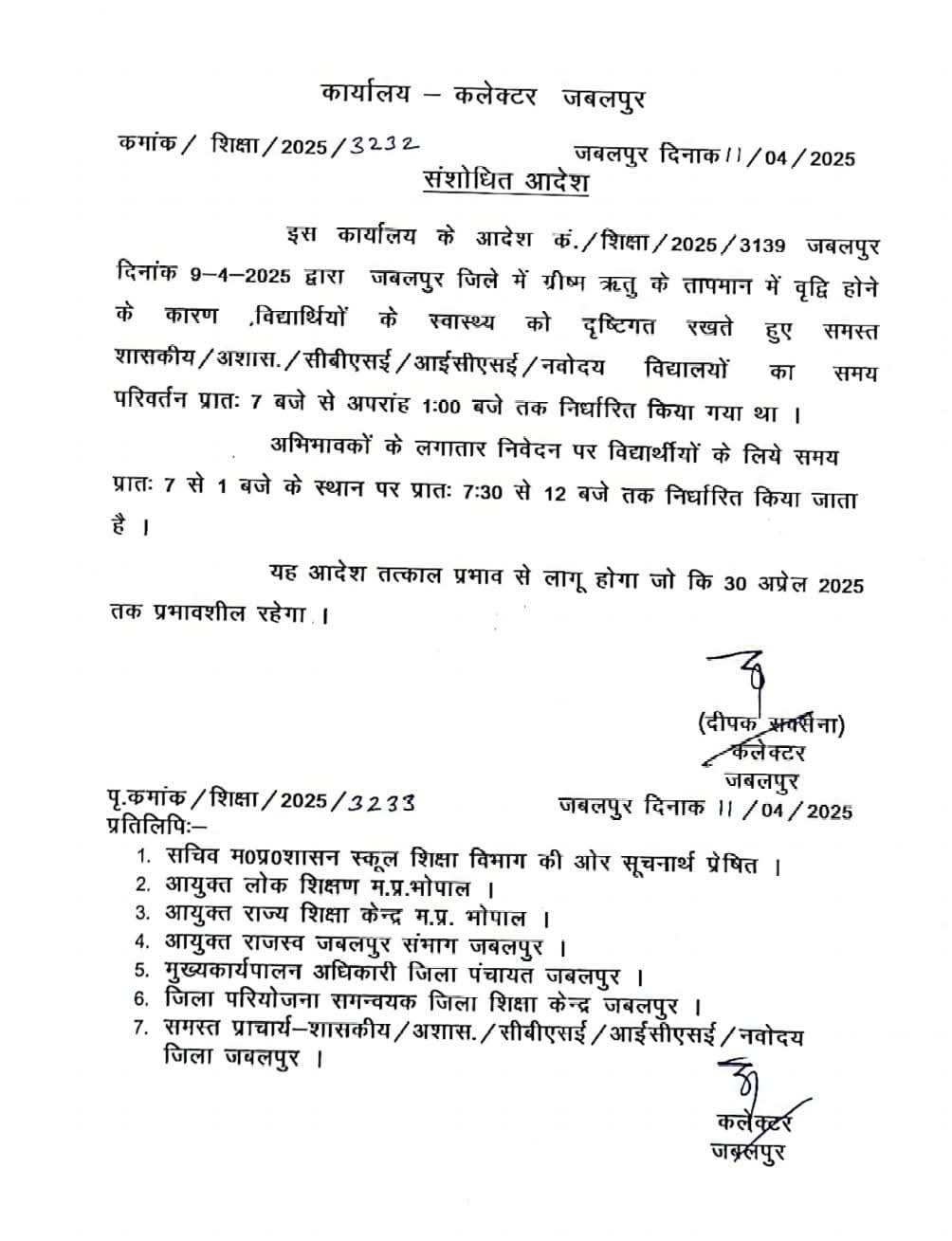 कलेक्टर द्वारा जारी संशोधित आदेश के अनुसार जिले में स्थित सभी शासकीय, अशासकीय, सीबीएसई, आईसीएसई और नवोदय विद्यालय अब सुबह 7.30 बजे से दोपहर 12 बजे तक लगेंगे। विद्यालयों के समय में परिवर्तन करने जारी किया गया संशोधित आदेश तत्काल प्रभाव से लागू हो गया है और 30 अप्रैल तक प्रभावी रहेगा। परीक्षाएं एवं मूल्यांकन कार्य निर्धारित समय अनुसार ही होंगे।