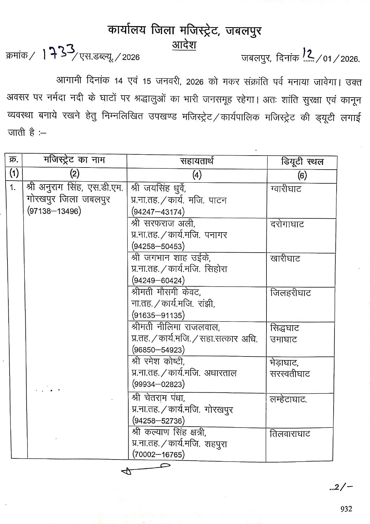 जिला दण्डाधिकारी एवं कलेक्टर राघवेंद्र सिंह के निर्देशानुसार मकर सक्रांति के मद्देनजर 14 और 15 जनवरी को नर्मदा के घाटों पर शांति, सुरक्षा एवं कानून व्यवस्था बनाये रखने कार्यपालिक दण्डाधिकारियों तैनात किया है।