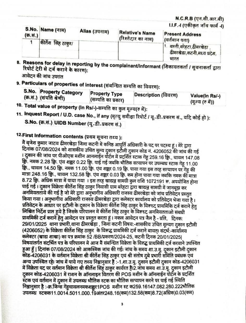 – विकासखण्ड ढीमरखेड़ा के शासकीय उचित मूल्य दुकान इटौली दुकान कोड नंबर 4206052 के दुकान विक्रेता कीर्तेश सिंह ठाकुर द्वारा गेंहू, चावल एवं शक्कर के खाद्यान्न के खुर्द-बुर्द और हेरा-फेरी करने से 10 लाख 72 हजार 191 रूपये का अपयोजन पाये जाने के मामले में बुधवार 29 जनवरी को कनिष्ठ आपूर्ति अधिकारी बृजेश कुमार जाटव द्वारा भारतीय न्याय संहिता और आवश्यक वस्तु अधिनियम की विभिन्न धाराओं के तहत ढीमरखेड़ा पुलिस थाना में एफआईआर दर्ज कराई गई।