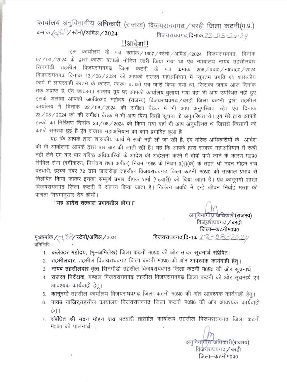 कलेक्टर श्री दिलीप कुमार यादव के निर्देशन में जिले में संचालित राजस्व महाभियान 2.0 के क्रियान्वयन में न्यूनतम प्रगति और शासकीय कार्य में लापरवाही बरतने पर अनुविभागीय अधिकारी राजस्व विजयराघवगढ़ श्री महेश मंडलोई ने विजयराघवगढ़ तहसील के हल्का नंबर 72 ग्राम जारारोडा के पटवारी मदन मोहन राय को तत्काल प्रभाव से निलंबित कर दिया है।