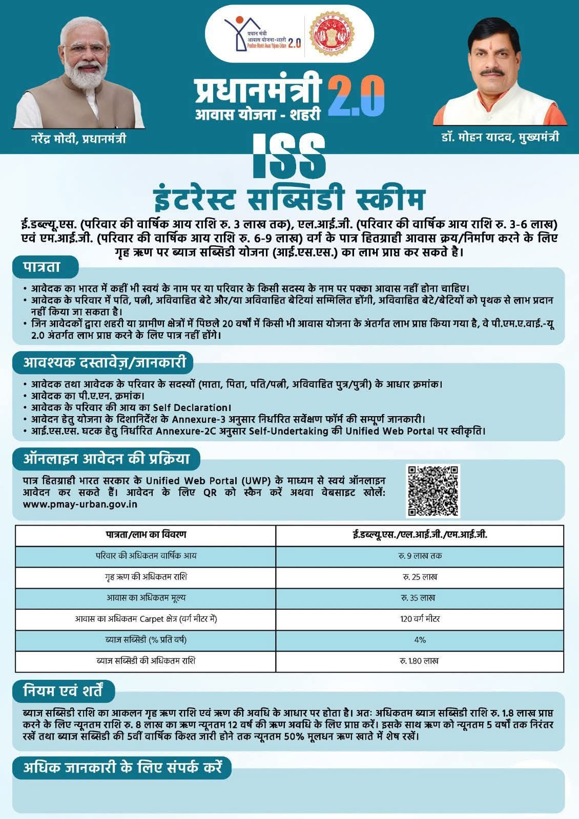 इसके तहत ई.डब्ल्यू.एस. (जिन परिवार की वार्षिक आय 3 लाख रूपए तक) एल.आई.जी. ( परिवार की वार्षिक आय 3-6 लाख रूपए तक) एम.आई.जी. (परिवार की वार्षिक आय 6-9 रूपए लाख तक) वर्ग के पात्र हितग्राही आवास क्रय, निर्माण करने के लिए गृह ऋण पर ब्याज सब्सिडी योजना का लाभ प्राप्त कर सकते है।