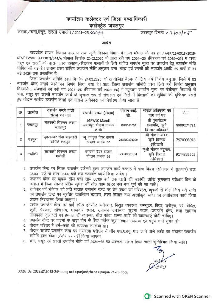 जिला उपार्जन समिति द्वारा रबी वर्ष 2024-25 में किसानों से चना, मसूर और सरसों के उपार्जन के लिये जिले में गोदाम स्तर पर तीन खरीदी केन्द्र स्थापित करने का निर्णय लिया है। ये केंद्र जबलपुर तहसील में कृषि उपज मंडी स्थित राज्य भंडार गृह निगम के गोदाम क्रमांक-2, शहपुरा तहसील में न्यू काकुल वेयर हाउस गोदाम क्रमांक-37 तथा मझौली तहसील में भगवती वेयर हाउस गोदाम क्रमांक-92 में स्थापित किये गये हैं।