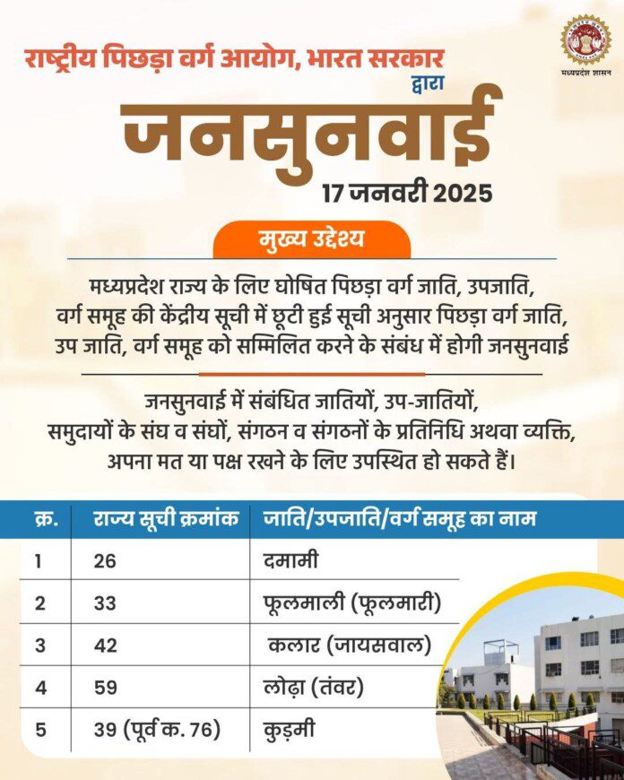 मध्यप्रदेश राज्य के लिए घोषित पिछड़ा वर्ग जाति, उपजाति, वर्ग समूह की केंद्रीय सूची में छूटी हुई सूची अनुसार पिछड़ा वर्ग जाति, उप जाति, वर्ग समूह को सम्मिलित करने के संबंध में होगी जनसुनवाई