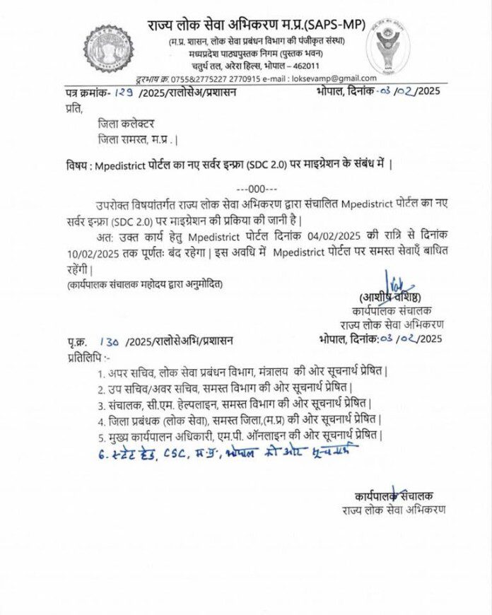 राज्य लोक सेवा अभिकरण मध्यप्रदेश द्वारा संचालित Mpedistrict पोर्टल नये सर्वर इंफ्रा (SDC 2.0) पर माइग्रेशन की प्रक्रिया के फलस्वरूप कल 4 फरवरी की रात 12 बजे के बाद से 10 फरवरी तक पूर्णतः बंद रहेगा।