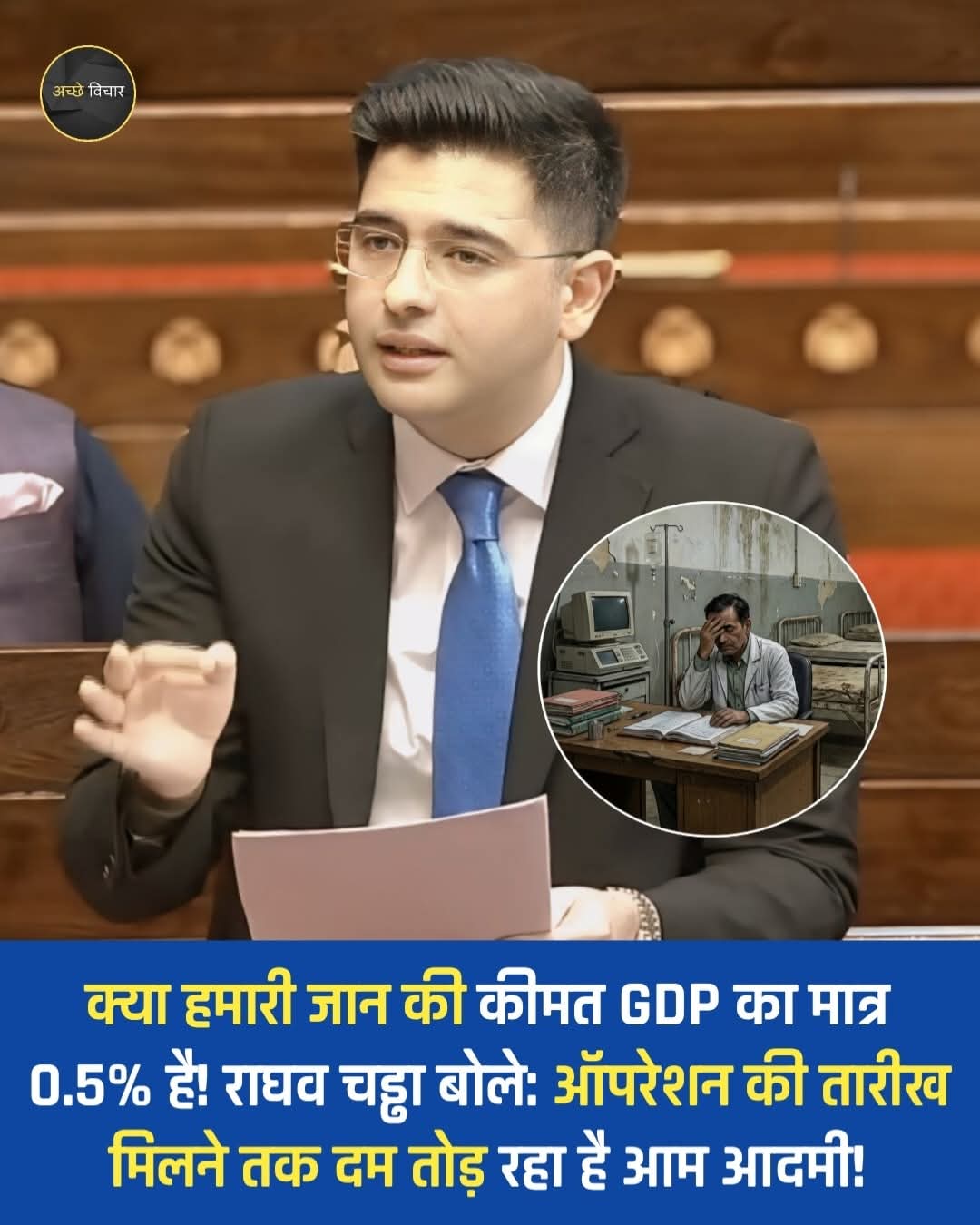 राज्यसभा में स्वास्थ्य सेवाओं को लेकर उठी आवाज़ ने देश को आईना दिखा दिया है। सांसद राघव चड्ढा ने सरकार के ही लक्ष्य को सामने रखते हुए कड़वा सच रखा—जब सार्वजनिक स्वास्थ्य पर खर्च GDP का 2.5% होना चाहिए, तब 2026 में भी भारत महज़ 0.5% पर अटका है। सवाल सीधा है: 140 करोड़ की आबादी की जान की कीमत क्या इतनी ही है?