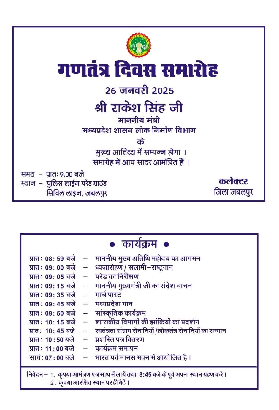 राष्ट्र का 76 वां गणतंत्र दिवस कल 26 जनवरी को जिले भर में हर्षोल्लास और उत्साह से मनाया जायेगा। जिले में गणतंत्र दिवस का मुख्य समारोह पुलिस लाइन परेड ग्राउंड में आयोजित किया गया है। यहां सुबह ठीक 9 बजे लोक निर्माण मंत्री श्री राकेश सिंह राष्ट्रीय ध्वज फहराकर परेड की सलामी लेंगे और प्रदेश की जनता के नाम मुख्यमंत्री श्री मोहन यादव के संदेश का वाचन करेंगे। इस अवसर पर आकर्षक मार्चपास्ट प्रस्तुत किया जायेगा। कलेक्टर दीपक सक्सेना ने नागरिकों से उमंग और उत्साहपूर्वक गणतंत्र दिवस मनाने का आग्रह किया है।