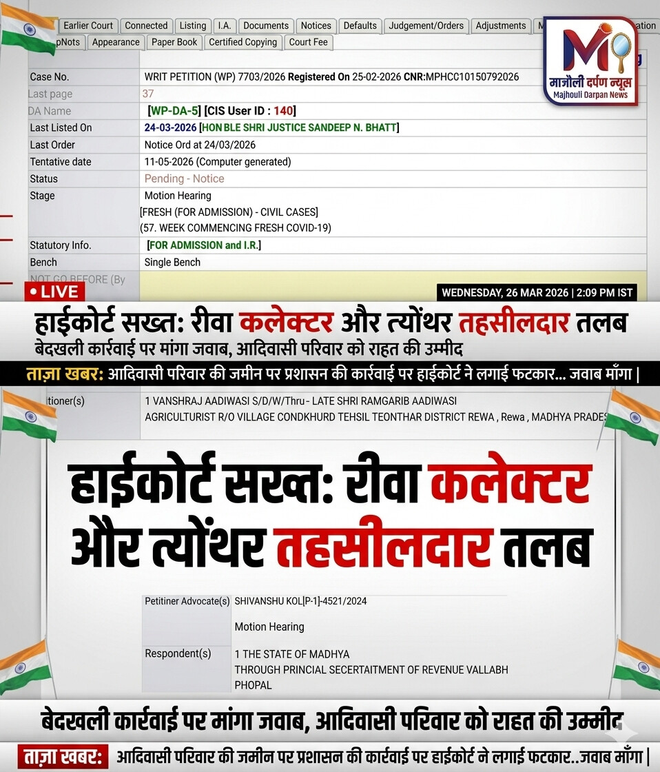 मध्यप्रदेश हाईकोर्ट ने रीवा जिले में एक आदिवासी परिवार के खिलाफ चल रही बेदखली कार्रवाई पर सख्त रुख अपनाया है। अदालत ने रीवा कलेक्टर और त्योंथर तहसीलदार सहित संबंधित अधिकारियों को नोटिस जारी कर तलब किया है और पूछा है कि आखिर किन नियमों के तहत यह कार्रवाई की गई।