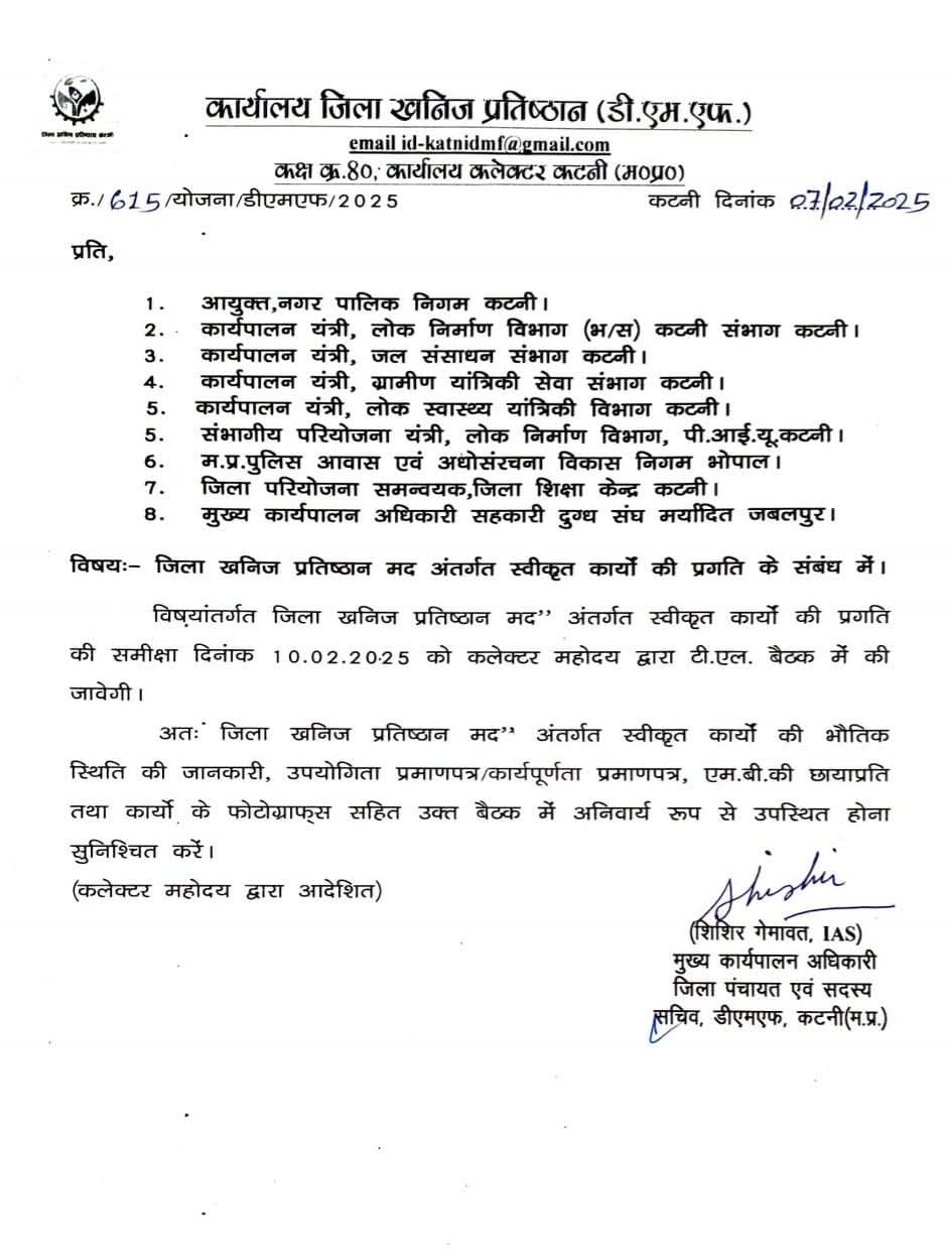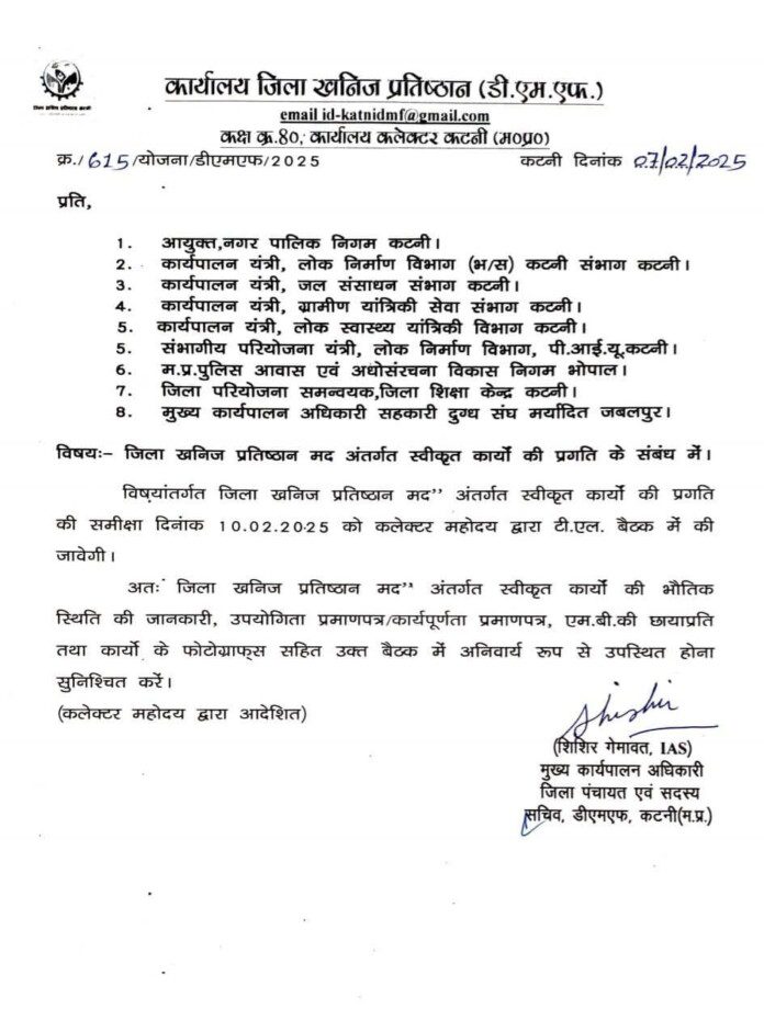 जिला परियोजना समन्वयक, जिला शिक्षा केन्द्र, मुख्य कार्यपालन अधिकारी सहकारी दुग्ध संघ मर्यादित जबलपुर को आयोजित बैठक में जिला खनिज प्रतिष्ठान मद” अंतर्गत स्वीकृत कार्यों की भौतिक स्थिति की जानकारी, उपयोगिता प्रमाणपत्र, कार्य पूर्णता प्रमाणपत्र, एम.बी.की छायाप्रति के साथ ही कार्यों के फोटोग्राफ्स की जानकारी सहित बैठक में अनिवार्य रूप से उपस्थित होने के निर्देश दिए है।