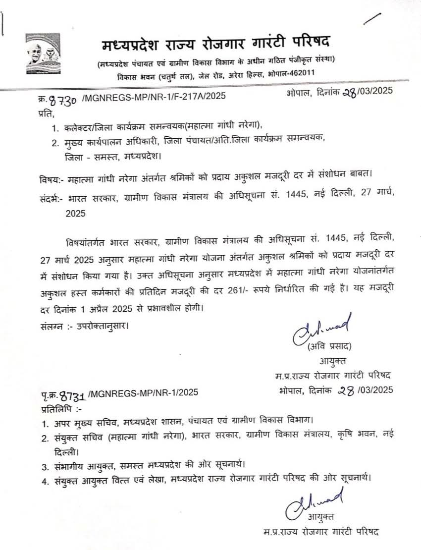 उक्त अधिसूचना के अनुसार मप्र में महात्मा गांधी नरेगा योजनांतर्गत अकुशल कर्मकारों की प्रतिदिन मजदूरी की दर 261 रुपये निर्धारित की गई है। यह मजदूरी दर एक अप्रैल 2025 से प्रभावशील होगी।