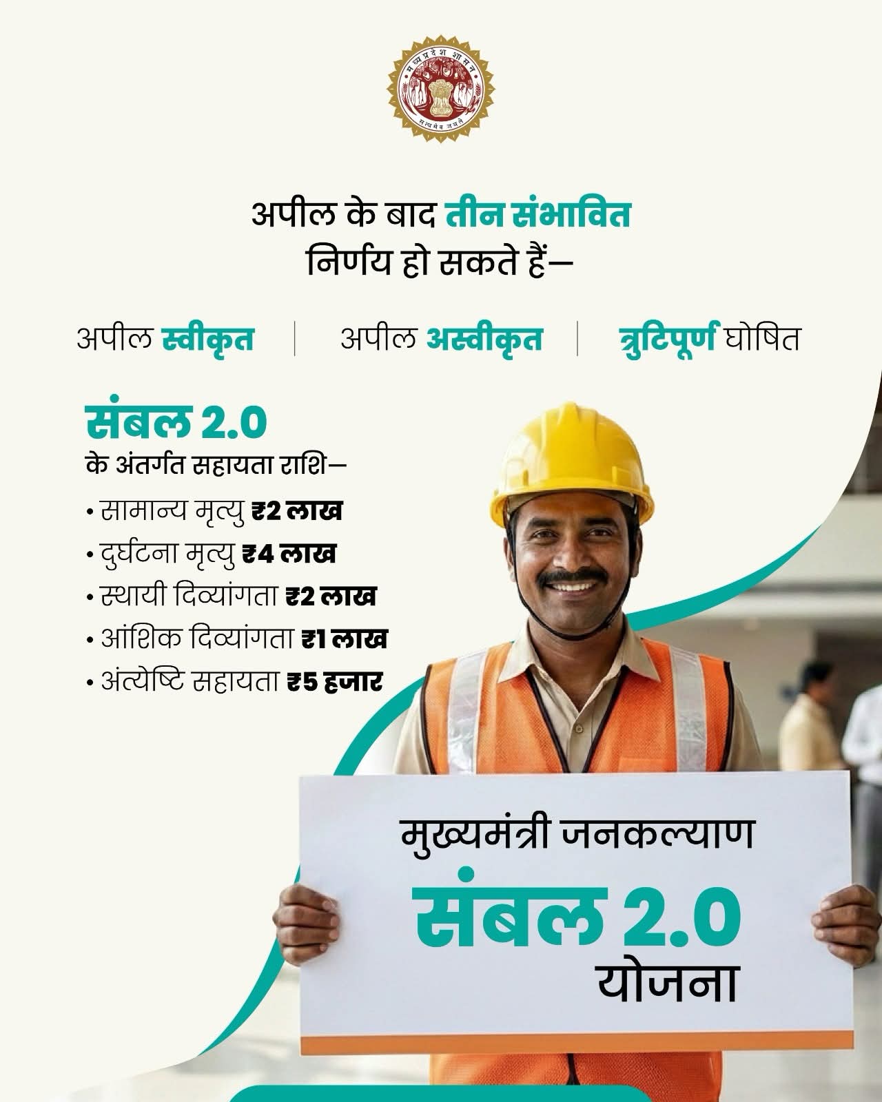 शासन ने श्रमिकों से अपील की है कि वे सही जानकारी दें, वैध दस्तावेज संलग्न करें और समय पर ऑनलाइन अपील कर अपने अधिकारों की रक्षा करें। संबल 2.0 के माध्यम से सरकार एक बार फिर श्रमिक कल्याण के प्रति अपनी प्रतिबद्धता दोहरा रही है।