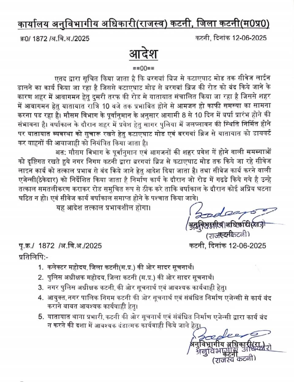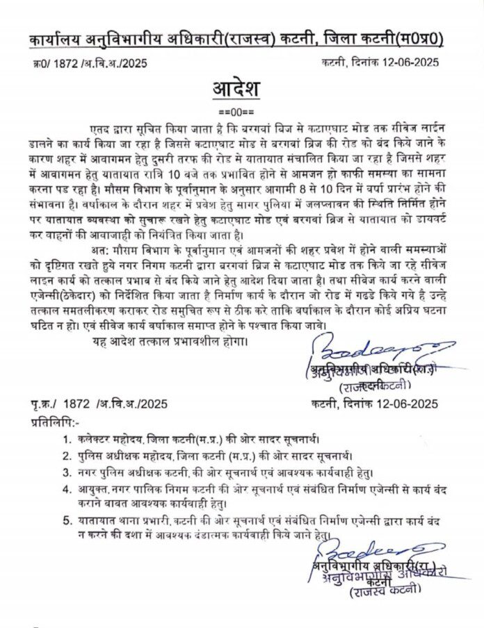। मौसम विभाग के पूर्वानुमान एवं आमजनों की शहर प्रवेश में होने वाली समस्याओं को दृष्टिगत रखते हुये एसडीएम कटनी श्री प्रदीप कुमार मिश्रा ने नगर निगम कटनी द्वारा बरगवां ब्रिज से कटाएघाट मोड़ तक किये जा रहे सीवेज लाइन कार्य को तत्काल प्रभाव से बंद करने का आदेश जारी किया है।
