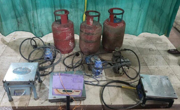 3 घरेलू सिलेण्डर, 3 इलैक्ट्रानिक तौल मशीन, 3 विघुत मोटर, नोजल जप्त