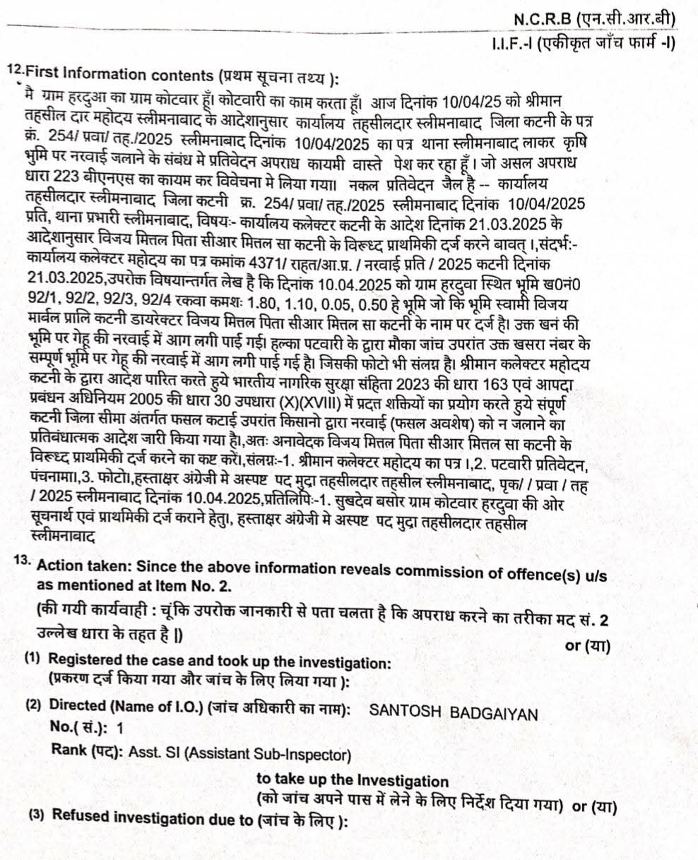 स्लीमनाबाद के ग्राम हरदुआ के कोटवार सुखदेव बसोर ने स्लीमनाबाद पुलिस थाना में प्राथमिकी दर्ज कराया है। कोटवार ने पुलिस थाना में पंचनामा और पटवारी का मौका मुआयना प्रतिवेदन ग्राम हरदुआ स्थित भूमि खसरा नंबर 92/1, 92/2, 92/3, 92/4 रकवा कमशः 1.80, 1.10, 0.05, 0.50 हेक्टेयर भूमि का प्रस्तुत किया। उल्लेखित खसरा नंबर की भूमि के स्वामी विजय मार्बल प्रा.लि.कटनी के डायरेक्टर विजय मित्तल पिता सीआर मित्तल निवासी कटनी है। उल्लेखित खसरा नंबर की भूमि पर हल्का पटवारी के द्वारा मौका जांच उपरांत इस खसरा नंबर के सम्पूर्ण भूमि पर गेहूं की नरवाई में आग लगी पाई गई है।साथ ही कलेक्टर एवं जिला दंडाधिकारी श्री दिलीप कुमार यादव द्वारा फसल अवशेष नरवाई संबंधी जारी प्रतिबंधात्मक आदेश का उल्लंघन किया जाना पाया गया।इस पर स्लीमनाबाद पुलिस थाना में विजय मित्तल के विरुद्ध भारतीय न्याय संहिता की धारा 223 के तहत प्राथमिकी दर्ज की गई।