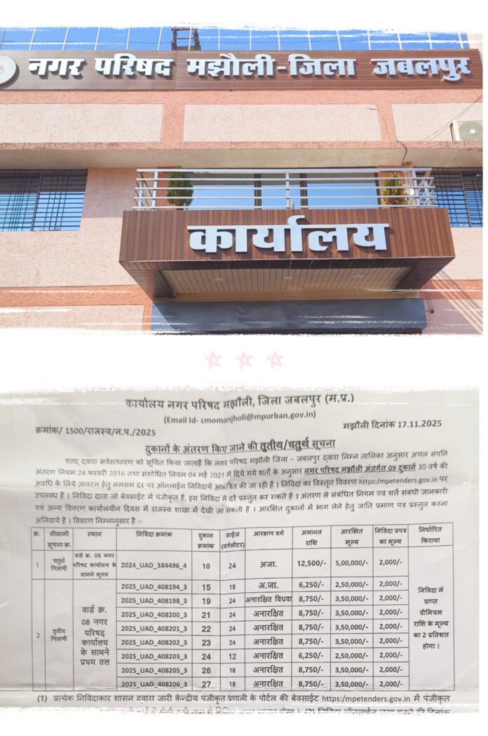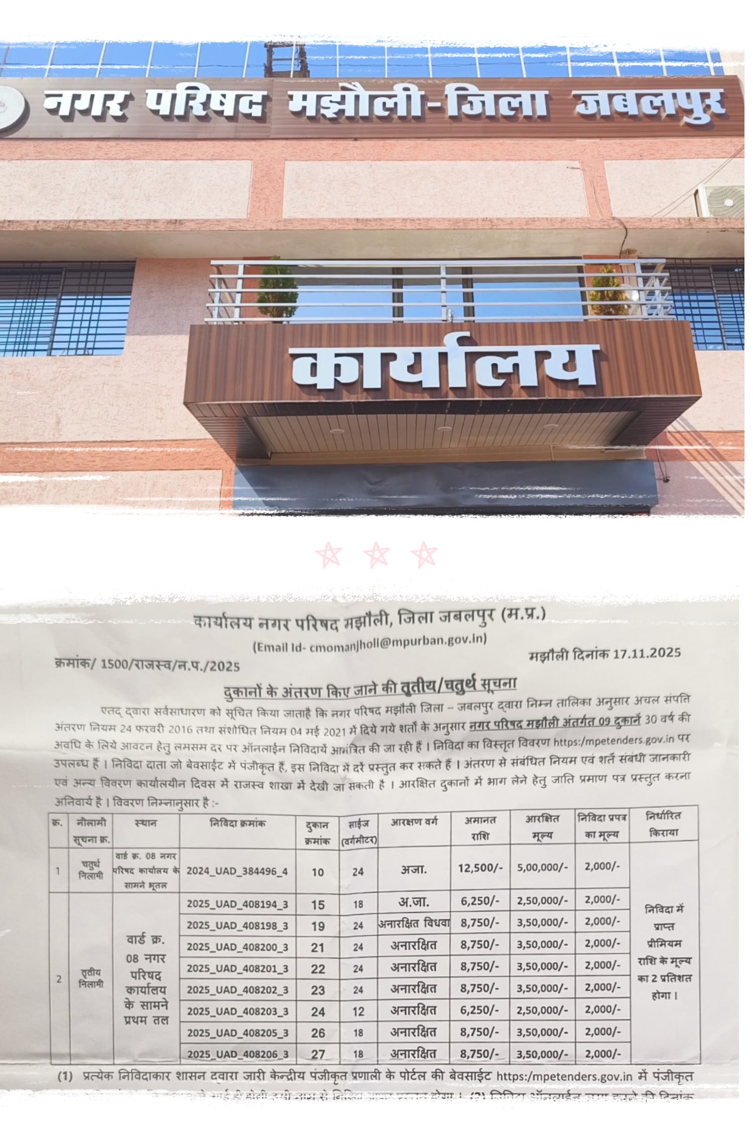 नगर परिषद मझौली द्वारा 17 नवंबर 2025 को जारी की गई दुकानों के अंतरण की तृतीय/चतुर्थ सूचना अब सवालों के घेरे में है।