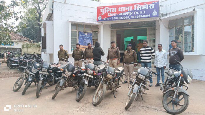 आदेश के परिपालन में प्रभारी अतिरिक्त पुलिस अधीक्षक ग्रामीण/अति. पुलिस अधीक्षक जोन 04 /यातायात सुश्री अंजना तिवारी , प्रभारी एस.डी.ओ.पी. सिहोरा /उप पुलिस अधीक्षक ग्रामीण श्रीमति आकांक्षा उपाध्याय के मार्गदर्शन मे थाना सिहोरा की टीम द्वारा एक शातिर वाहन चोर को गिरफ्तार कर चुराई हुई 8 मोटर सायकिलें कीमती 5 लाख रूपये की जप्त की गयी है।