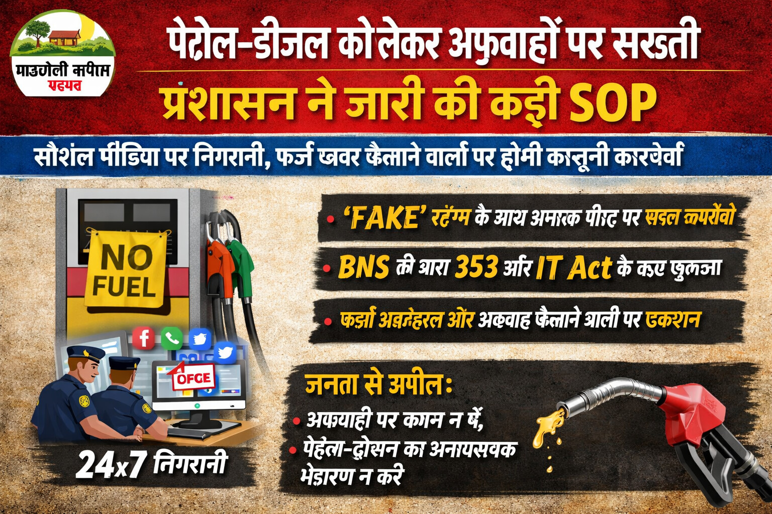 SOP के तहत अब— पुलिस और जनसंपर्क विभाग की संयुक्त टीम 24 घंटे सोशल मीडिया मॉनिटरिंग करेगी“पेट्रोल खत्म”, “हड़ताल”, “कमी” जैसे कीवर्ड्स पर विशेष नजर रहेगी भ्रामक पोस्ट पर “FAKE” स्टैम्प लगाकर आधिकारिक खंडन जारी किया जाएगा