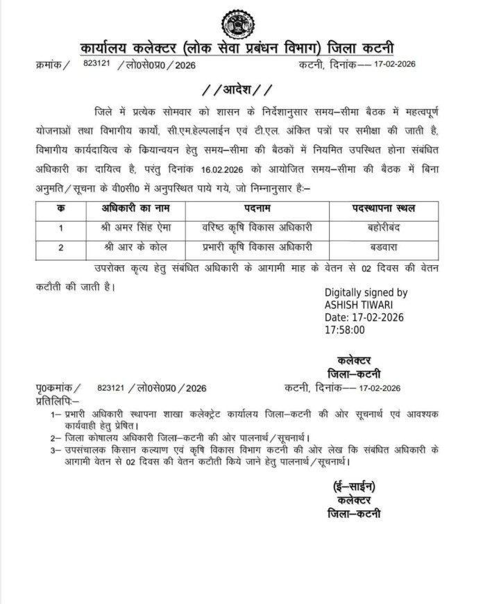 यह कार्रवाई बहोरीबंद विकासखंड के वरिष्ठ कृषि विकास अधिकारी अमर सिंह ऐमा और बड़वारा विकासखंड के कृषि अधिकारी आर.के. कोल के खिलाफ की गई है। दोनों अधिकारी 16 फरवरी को आयोजित समय-सीमा बैठक में बिना अनुमति और बिना किसी सूचना के अनुपस्थित पाए गए।