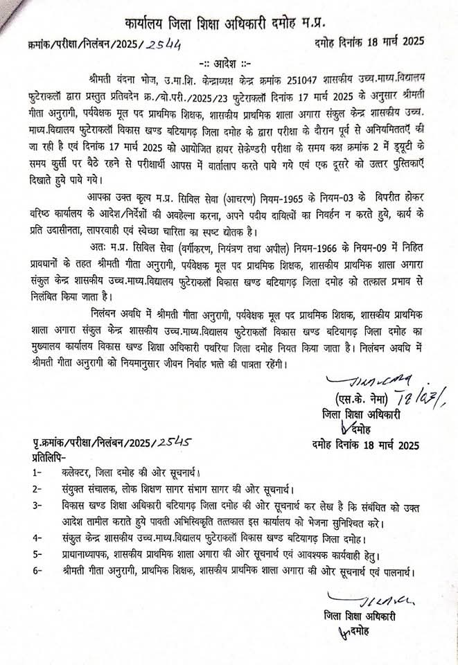 जिला शिक्षा अधिकारी एसके नेमा ने पर्यवेक्षक गीता अनुरागी द्वारा वरिष्ठ कार्यालय के आदेश/निर्देशों की अवहेलना, अपने पदीय दायित्वों का निवर्हन न करते हुये, कार्य के प्रति उदासीनता, लापरवाही के आरोप में मूल पद प्राथमिक शिक्षक, शासकीय प्राथमिक शाला अगारा संकुल केन्द्र शासकीय उच्च. माध्य. विद्यालय फुटेराकलॉ विकास खण्ड बटियागढ़ दमोह को तत्काल प्रभाव से निलंबित कर दिया है।