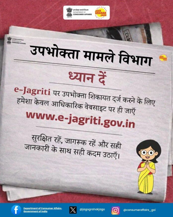 प्रशासन ने स्पष्ट किया है कि किसी भी प्रकार की शिकायत दर्ज कराने के लिए केवल e-Jagriti की आधिकारिक वेबसाइट [www.e-jagriti.gov.in](http://www.e-jagriti.gov.in) का ही उपयोग करें। इसके अलावा किसी भी अनजान, गलत, भ्रामक या संदिग्ध लिंक पर क्लिक न करने की सख्त अपील की गई है।
