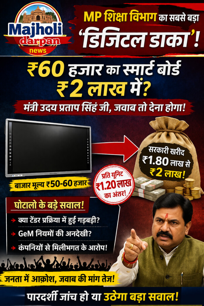 मध्य प्रदेश के शिक्षा विभाग में डिजिटल शिक्षा को बढ़ावा देने के नाम पर एक बहुत बड़े ‘सुनियोजित घोटाले’ की आशंका ने तूल पकड़ लिया है। प्रदेशभर के सरकारी स्कूलों में स्मार्ट क्लासरूम (Smart Classrooms) बनाने के लिए खरीदे गए डिजिटल स्मार्ट बोर्ड (Digital Smart Boards) की कीमतों में बाज़ार मूल्य और सरकारी खरीद मूल्य के बीच चौंकाने वाला भारी अंतर सामने आया है।