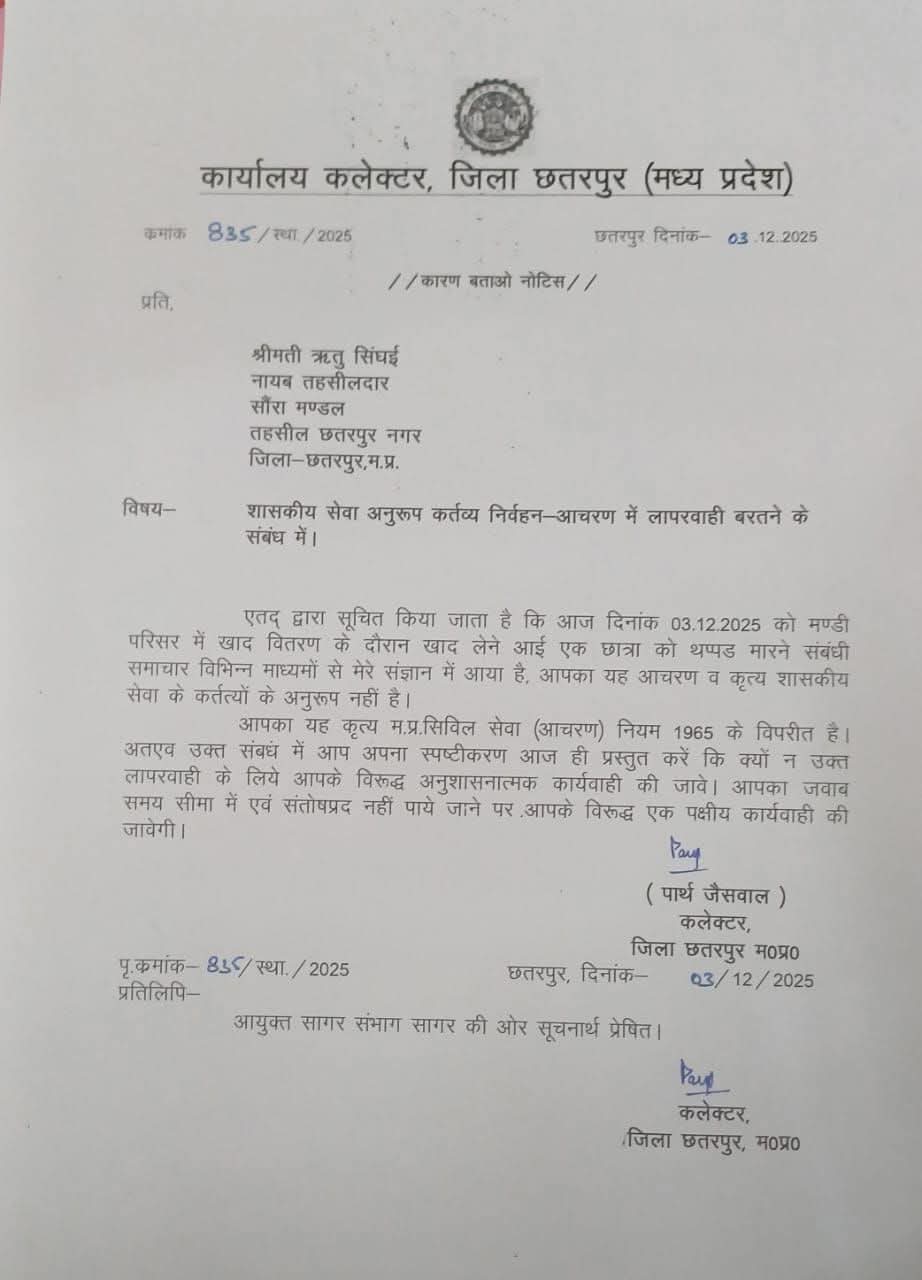 समाचारो के माध्यम से जानकारी मिलने पर खाद वितरण में विवाद को गंभीरता से लेते हुए कलेक्टर श्री पार्थ जैसवाल ने शासकीय सेवा अनुरूप कर्तव्य निर्वहन आचरण में लापरवाही बरतने के संबंध में नायब तहसीलदार श्रीमती ऋतु सिंघई नायब तहसीलदार सौरा मंडल को कारण बताओ नोटिस जारी किया है। गौरतलब है कि मण्डी परिसर में खाद वितरण के दौरान खाद लेने आई एक छात्रा को थप्पड़ मारने की खबर पर तत्काल संज्ञान लेते हुए कलेक्टर ने नोटिस जारी कर कहा है कि नायब तहसीलदार का कृत्य म.प्र. सिविल सेवा (आचरण) नियम 1965 के विपरीत है। अतएव उक्त संबंध में आप अपना स्पष्टीकरण आज ही प्रस्तुत करें कि क्यों न उक्त लापरवाही के विरूद्ध अनुशासनात्मक कार्यवाही की जाए। जवाब समय सीमा में एवं संतोषप्रद नहीं पाये जाने पर संबंधित के विरूद्ध एक पक्षीय कार्यवाही की जाएगी।