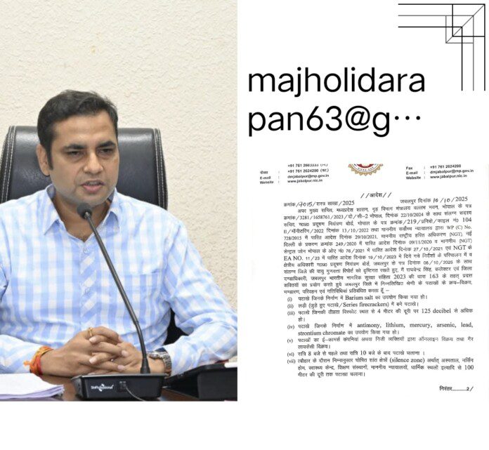 जिला दण्डाधिकारी एवं कलेक्टर राघवेन्द्र सिंह ने माननीय सर्वोच्च न्यायालय एवं राष्ट्रीय हरित अधिकरण द्वारा जारी दिशा-निर्देशों तथा मध्यप्रदेश प्रदूषण नियंत्रण बोर्ड जबलपुर के क्षेत्रीय अधिकारी द्वारा भेजी गई जिले की वायु गुणवत्ता रिपोर्ट को दृष्टिगत रखते हुये भारतीय नागरिक सुरक्षा संहिता-2023 की धारा 163 के तहत प्रतिबंधात्मक आदेश जारी कर जिले में ऐसे पटाखों के क्रय-विक्रय भण्डारण एवं परिवहन की गतिविधियों पर रोक लगा दी है, जिनके निर्माण में बेरियम साल्ट का इस्तेमाल किया गया है।