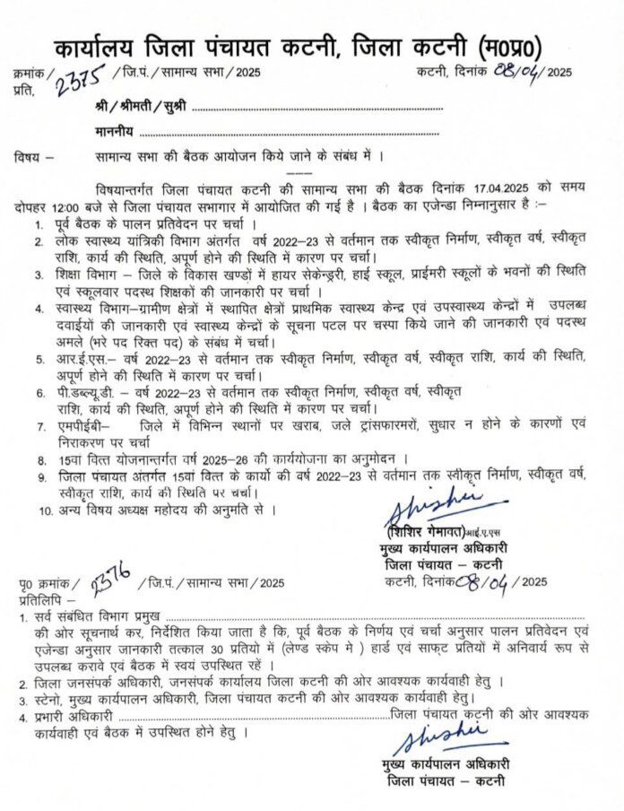 उन्होंने जिला पंचायत अध्यक्ष , उपाध्यक्ष और सामान्य सभा के सदस्यों से बैठक में उपस्थिति की अपील की है।