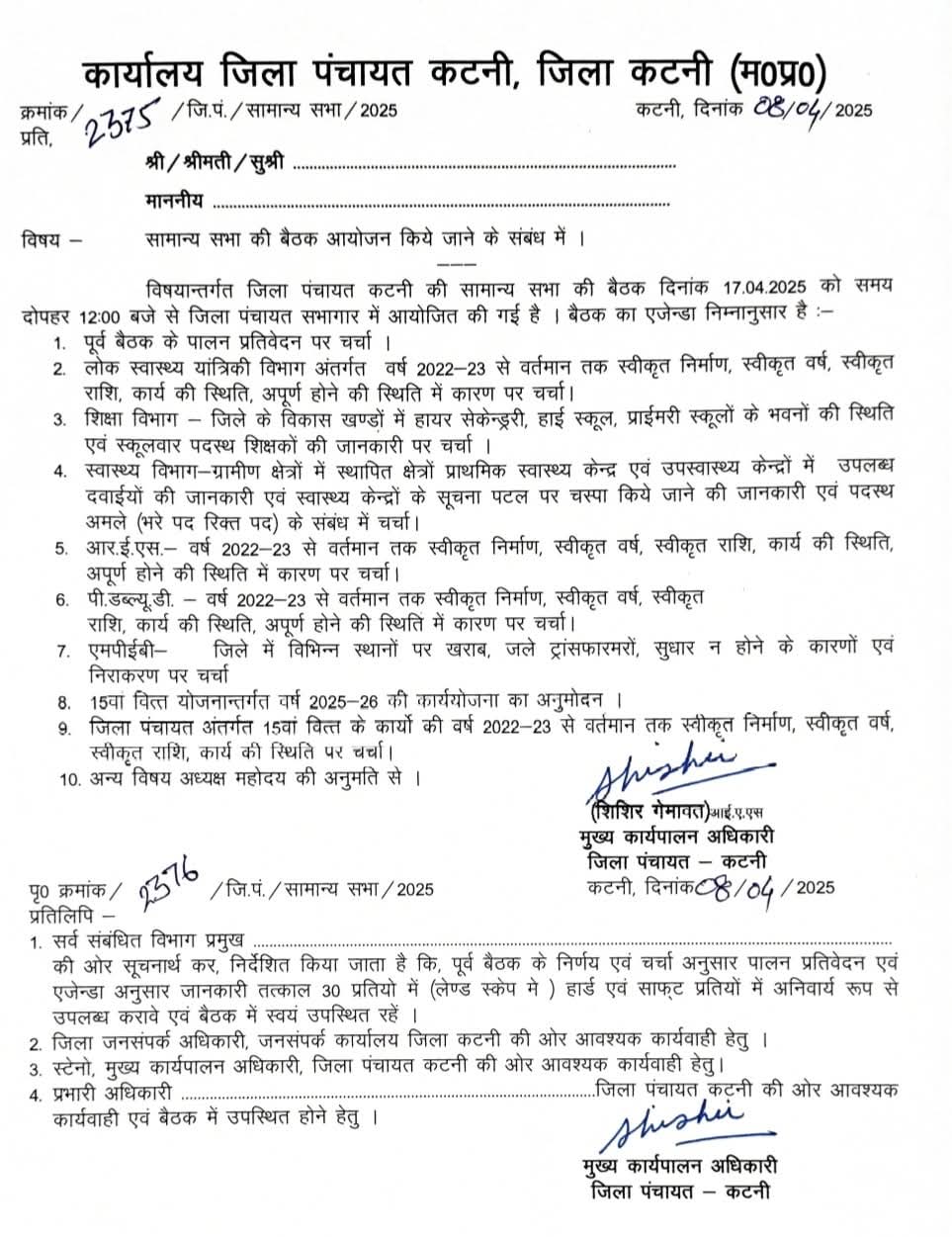 मुख्य कार्यपालन अधिकारी जिला पंचायत श्री शिशिर गेमावत ने बताया कि जिला पंचायत की सामान्य सभा की बैठक 17 अप्रैल 2025 को दोपहर 12 बजे से जिला पंचायत कार्यालय के सभाकक्ष में आयोजित की गई है ।