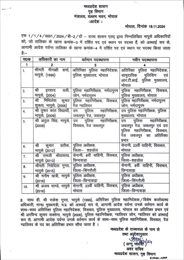 गृह विभाग ने भारतीय पुलिस सेवा के अधिकारियों को वर्तमान पदस्थापना से स्थानांतरित करते हुए नवीन पद स्थापना के आदेश जारी किए गए हैं।