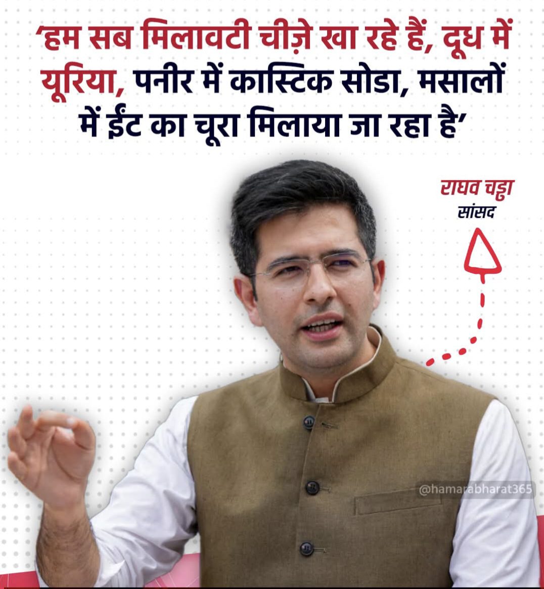 सांसद चड्ढा ने आरोप लगाते हुए कहा कि दूध में यूरिया, सब्जियों में ऑक्सीटोसिन, पनीर में कास्टिक सोडा, मसालों में ईंट का चूरा, शहद में कृत्रिम पीला रंग, मुर्गी के मांस में स्टेरॉयड तथा आइसक्रीम में डिटर्जेंट तक मिलाए जाने जैसी चौंकाने वाली घटनाएं सामने आ रही हैं। उन्होंने कहा कि ऐसी मिलावट न केवल उपभोक्ताओं को धोखा है, बल्कि यह सीधे तौर पर लोगों के स्वास्थ्य और जीवन के लिए बड़ा खतरा है।
