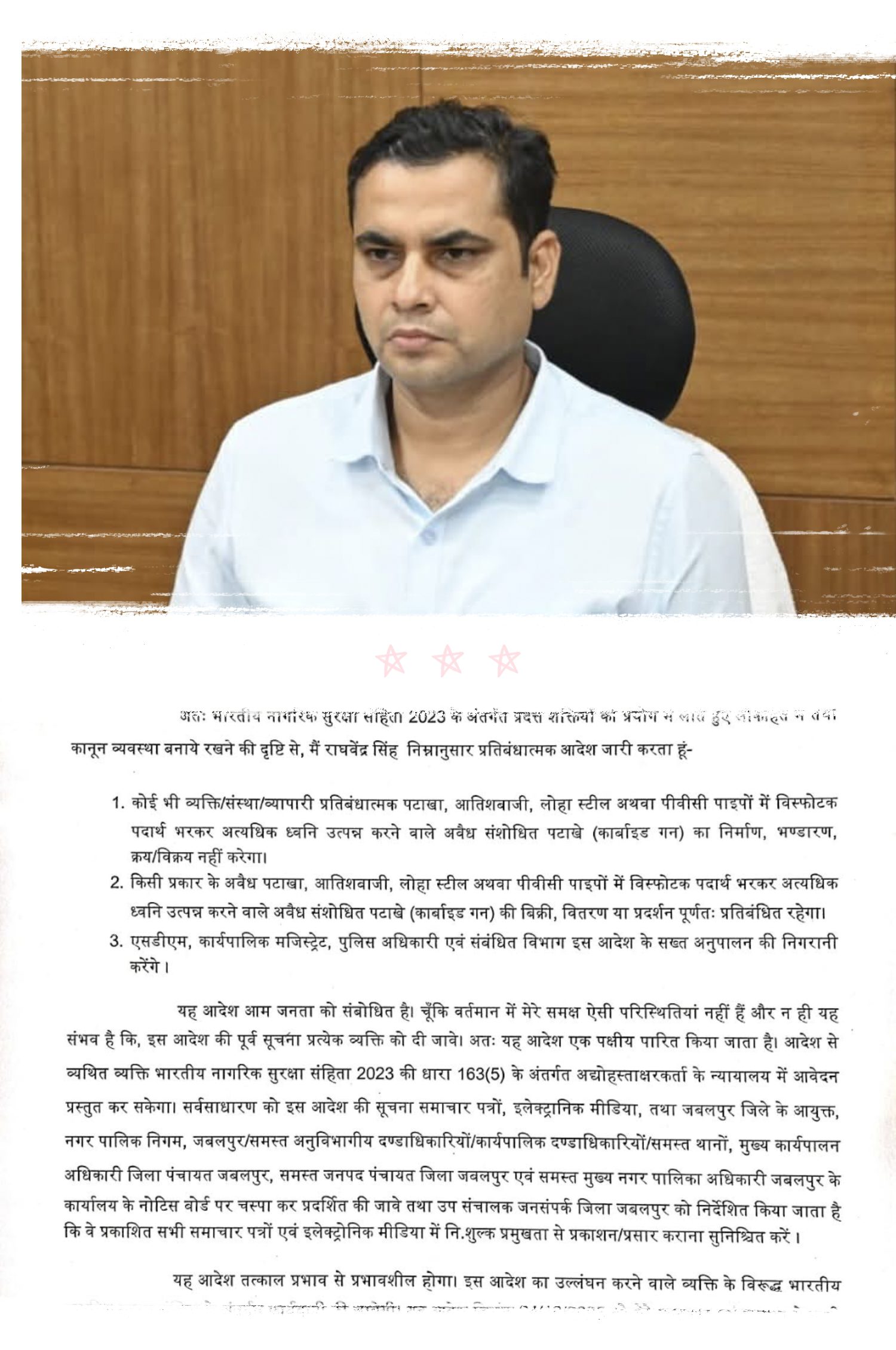 जिला दंडाधिकारी द्वारा जारी प्रतिबंधात्‍मक आदेश में कहा गया है कि समाचार माध्‍यमों एवं सोशल मीडिया में प्रकाशित और प्रसारित खबरों से यह संज्ञान में आया है कि स्‍टील अथवा पीवीसी पाइपों में विस्‍फोटक पदार्थ भरकर अत्‍यधिक ध्‍वनि उत्‍पन्‍न करने वाले अवैध संशोधित पटाखे (कार्बाइड गन) विक्रय किये जा रहे हैं। इसमें भरा कैल्शियम कार्बाइड आंखो तथा चेहरे को नुकसान पहुंचाता है, जिससे आम नागरिकों को गंभीर हानि होने की संभावना है। आदेश में कहा गया है कि प्रतिबंधात्‍मक आदेश से व्‍यथित व्‍यक्ति भारतीय नागरिक सुरक्षा संहिता 2023 की धारा 163(5) के अंतर्गत कलेक्‍टर न्‍यायालय में आवेदन प्रस्‍तुत कर सकेगा। प्रतिबंधात्‍मक आदेश में इसका उल्‍लंघन करने वाले व्‍यक्ति के विरूद्ध भारतीय नागरिक सुरक्षा संहिता के अंतर्गत कार्यवाही की चेतावनी दी गई है।