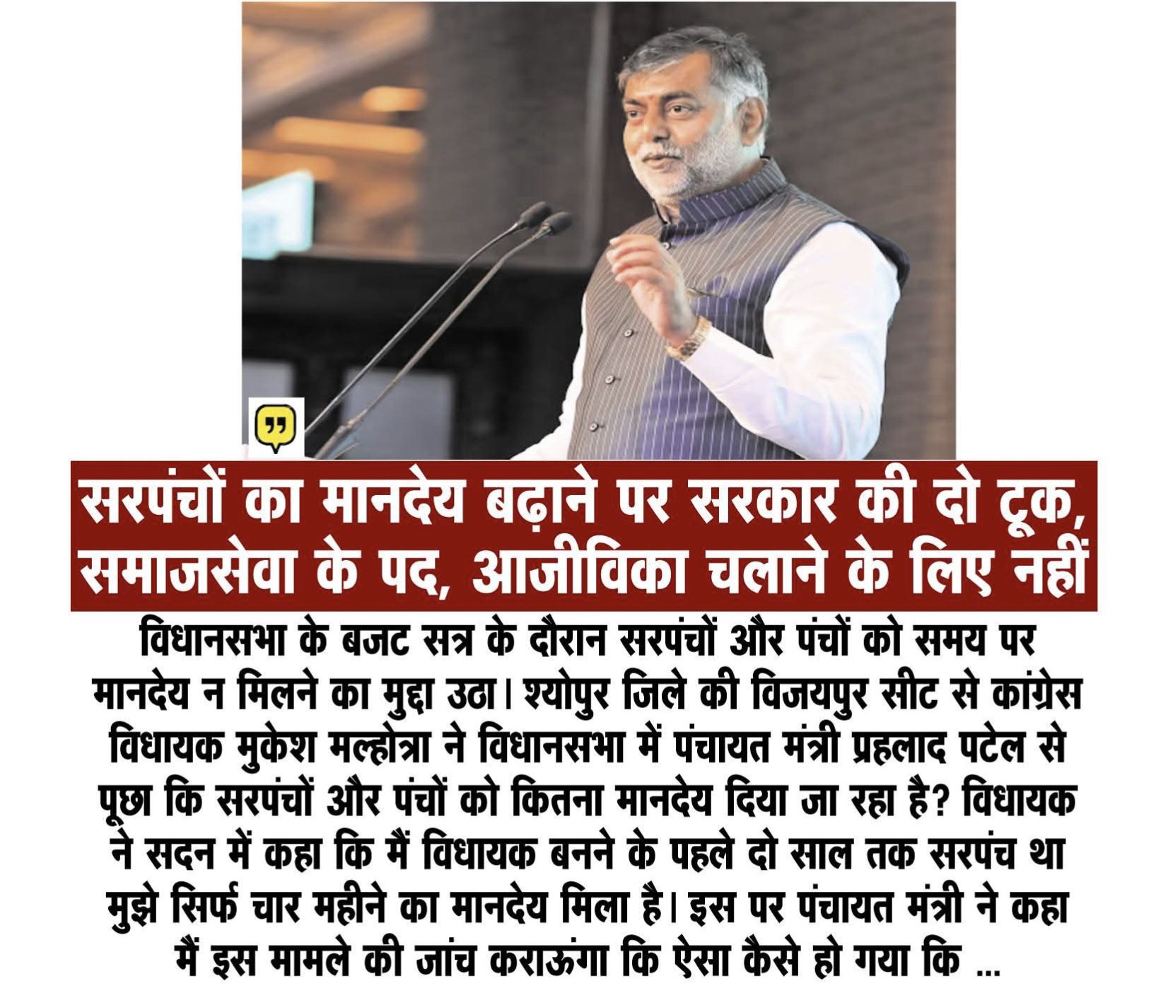 पंचायत प्रतिनिधियों के मानदेय बढ़ाने की मांग के बीच पंचायत मंत्री प्रहलाद सिंह पटेल ने दो टूक बयान देते हुए कहा है कि सरपंच और पंच का पद मूलतः समाजसेवा के लिए है, न कि नियमित रोजगार के रूप में। उन्होंने स्पष्ट किया कि वर्तमान में जो मानदेय प्रावधान है, वही नियमानुसार दिया जा रहा है।