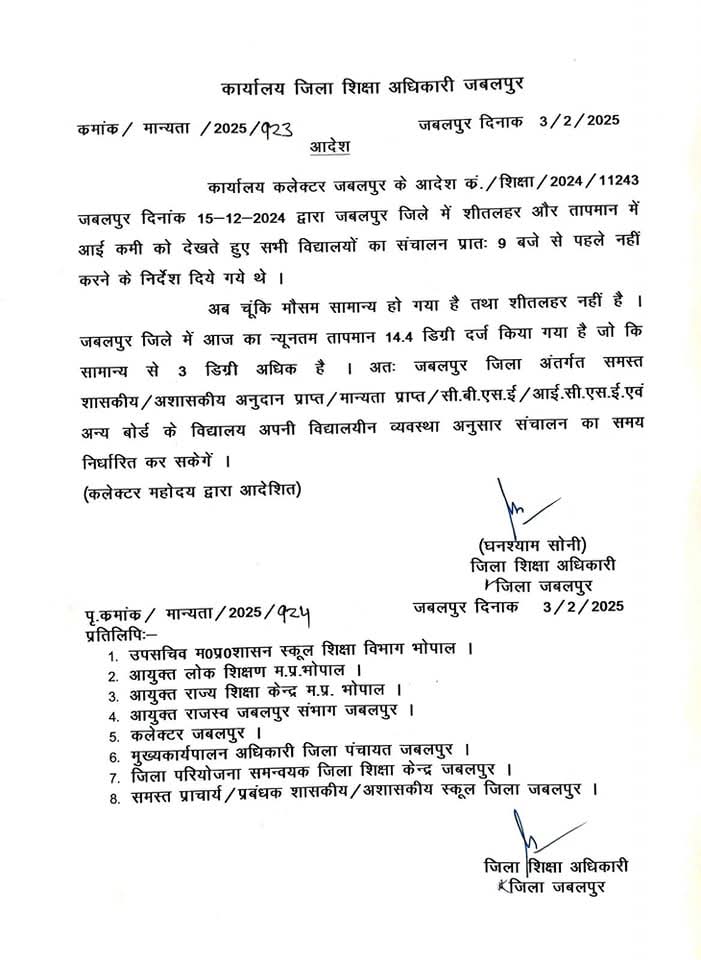 जिला शिक्षा अधिकारी घनश्याम सोनी के मुताबिक मौसम अब सामान्य हो गया है और न्यूनतम तापमान 14.4 डिग्री रिकार्ड किया गया है। इसे देखते हुये जिले में स्थित सभी शासकीय, अशासकीय एवं मान्यता प्राप्त शालायें विद्यालयीन व्यवस्था के अनुसार कक्षाओं के संचालन का समय निर्धारित कर सकेंगी।