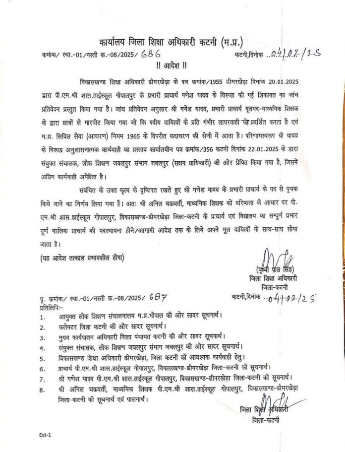 पी.एम.श्री शास. हाई स्कूल गोपालपुर के प्रभारी प्राचार्य के द्वारा छात्रों से की गई मारपीट के मामले की जांच के बाद श्री यादव को प्रभारी प्राचार्य के पद से पृथक कर दिया गया है।