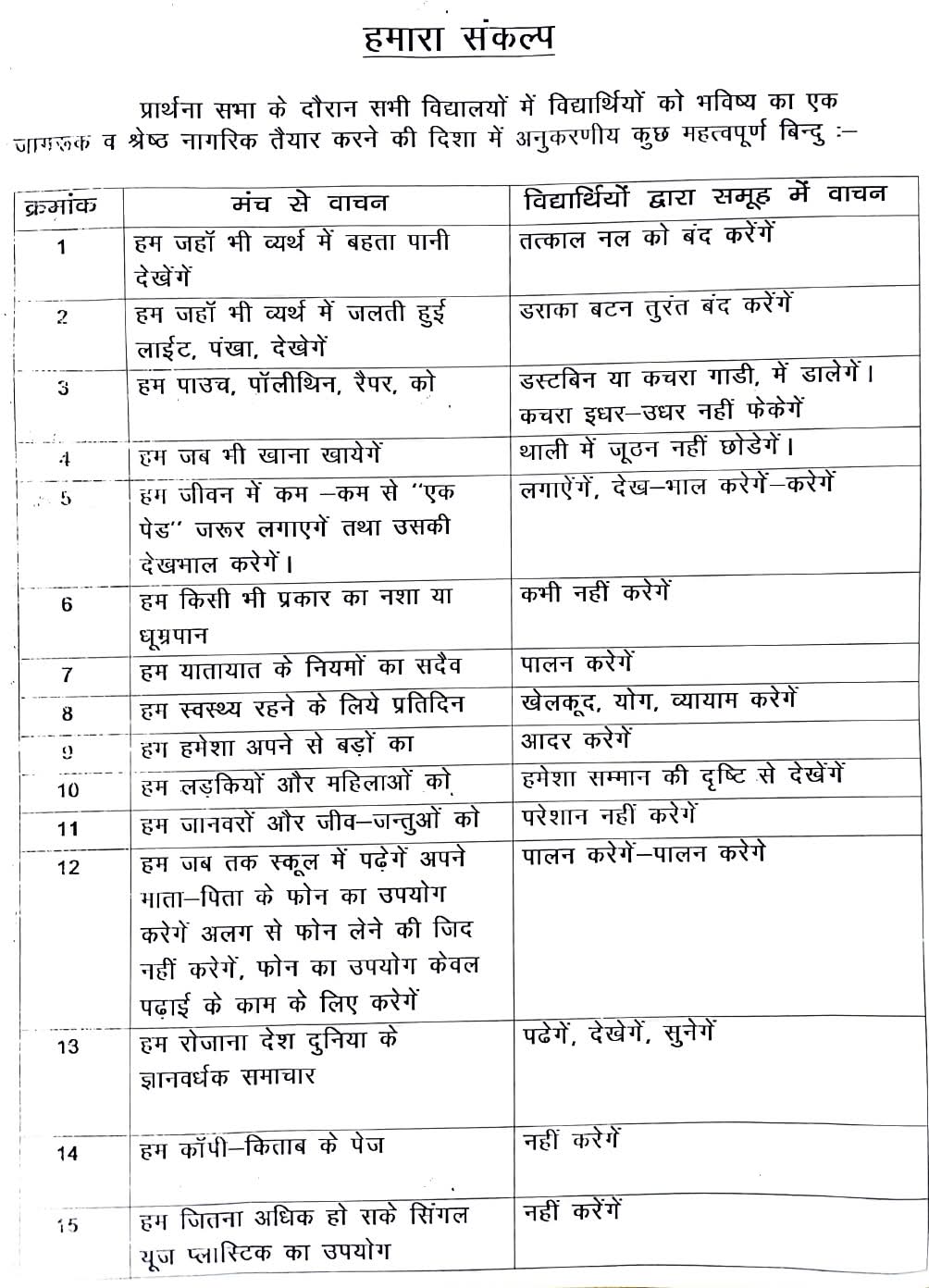 कक्षा तीसरी से 12 वीं तक के विद्यार्थियों हेतु अच्छी आदतों के विकास तथा समाज के श्रेष्ठ व भावी नागरिक बनाने की दिशा में एक संकल्प पत्र तैयार किया गया है, जिसका वाचन प्रार्थना सभा के दौरान प्रतिदिन किया जाएगा।