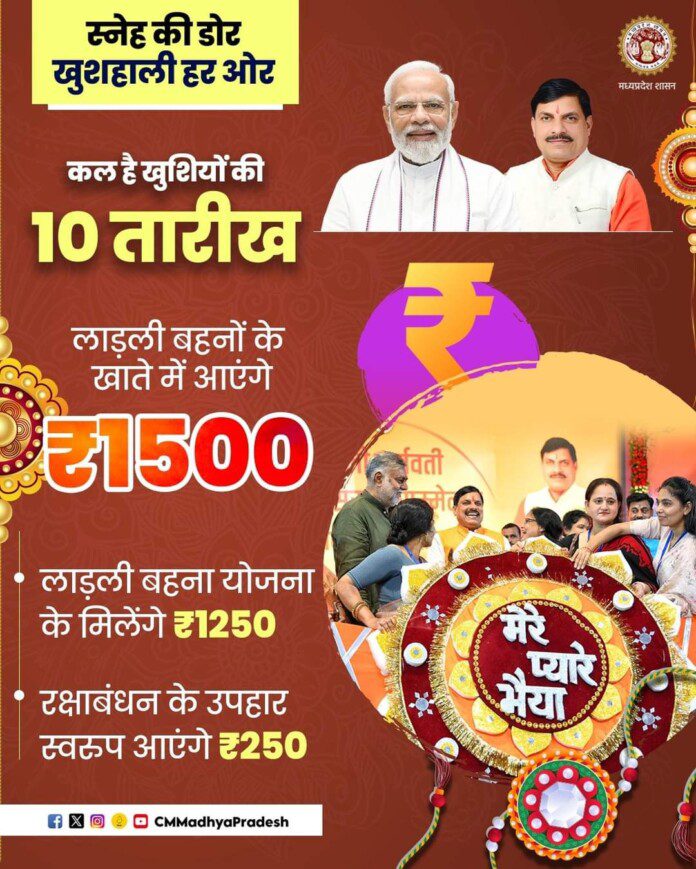 प्रदेश की लाड़ली बहनें रक्षाबंधन के पहले दोगुनी खुशियाँ मनाएंगी। मुख्यमंत्री डॉ. मोहन यादव 10 अगस्त को मुख्यमंत्री लाड़ली बहना योजना की हितग्राही बहनों के खातों में 1250 रूपये की राशि अंतरित करेंगे। साथ ही रक्षाबंधन के उपहार स्वरूप लाभार्थी महिलाओं के खातों में 250 रूपये की उपहार (नेग) राशि अंतरित की जाएगी। मुख्यमंत्री डॉ. यादव श्योपुर जिले के विजयपुर और टीकमगढ़ में 10 अगस्त को आयोजित रक्षाबंधन पूर्व लाड़ली बहना हितग्राहियों के लिए आभार सह उपहार कार्यक्रम में यह राशि अंतरित करेंगे। साथ ही लाभार्थी महिलाओं को आभार-पत्र और उपहार देगें और राखी बंधवाएगें।