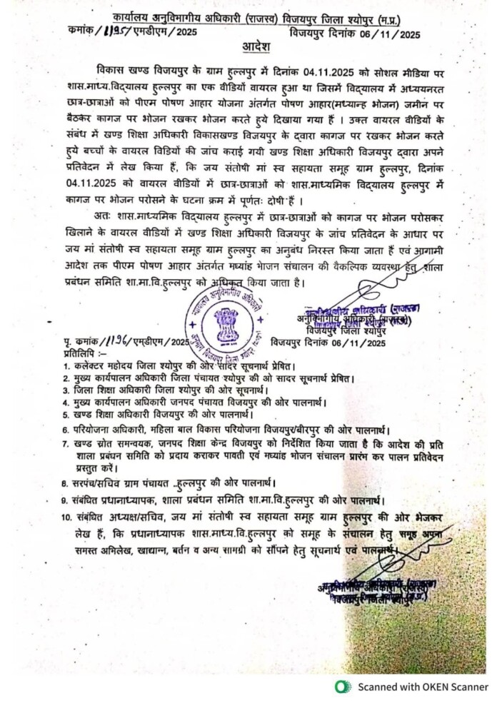 सोशल मीडिया पर वायरल हुए एक वीडियो ने शिक्षा विभाग में हड़कंप मचा दिया है। वीडियो में शासकीय माध्यमिक विद्यालय हुल्लपुर के छात्र-छात्राएँ प्रधानमंत्री पोषण आहार (PM Poshan Yojana) का भोजन कागज़ पर रखकर खाते हुए** दिखाई दे रहे हैं। इस मामले को गंभीरता से लेते हुए जिला प्रशासन ने तुरंत जांच कर कार्रवाई की है।