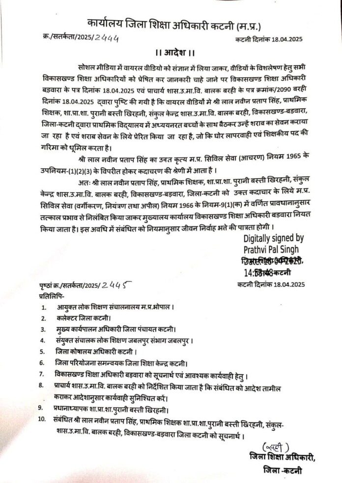 शुक्रवार 18 अप्रैल को जारी निलंबन आदेश में उल्लेखित किया गया है कि बच्चों को शराब सेवन पिलाना और पीने के लिये प्रेरित करना, घोर लापरवाही एवं शिक्षकीय पद की गरिमा को धूमिल करता है। साथ ही यह कृत्य म.प्र. सिविल सेवा (आचरण) नियम के विपरीत होकर कदाचरण की श्रेणी में आता है।इसलिए प्राथमिक शिक्षक, शा.प्रा.शा. पुरानी बस्ती खिरहनी श्री लाल नवीन प्रताप सिंह को तत्काल प्रभाव से निलंबित करते हुए उनका मुख्यालय कार्यालय विकासखण्ड शिक्षा अधिकारी बड़वारा नियत किया गया है। इस अवधि में संबंधित को नियमानुसार जीवन निर्वाह भत्ते की पात्रता होगी ।